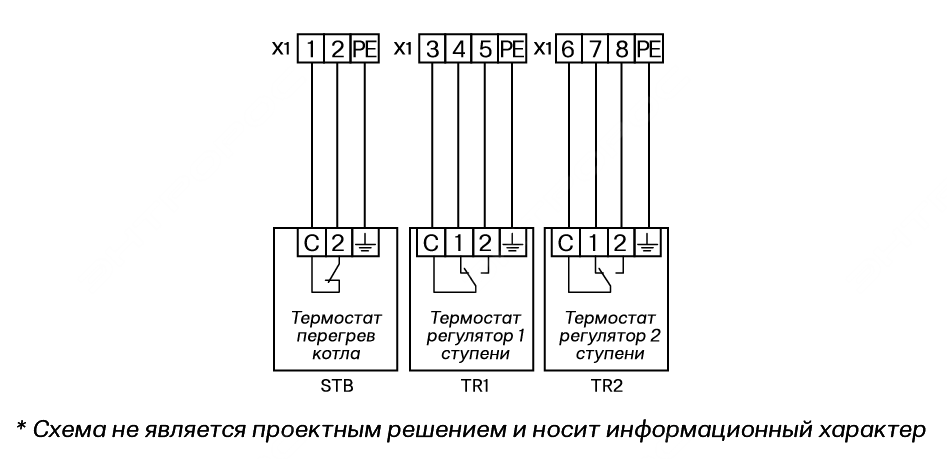 - независимое управление горелкой в двухступенчатом режиме TR1, TR2.