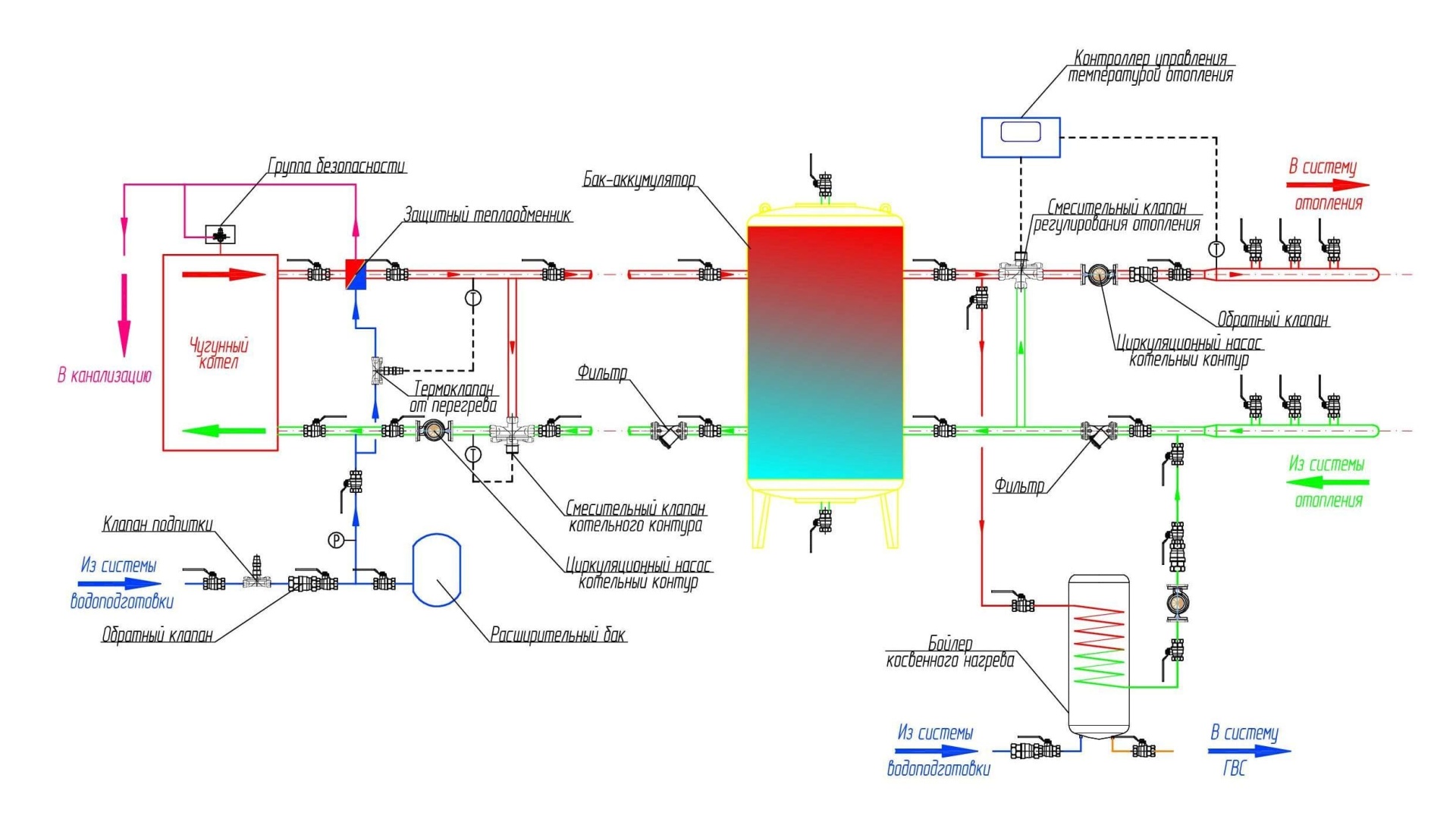 Схема обвязки и подключения чугунных котлов - газовых и твердотопливных